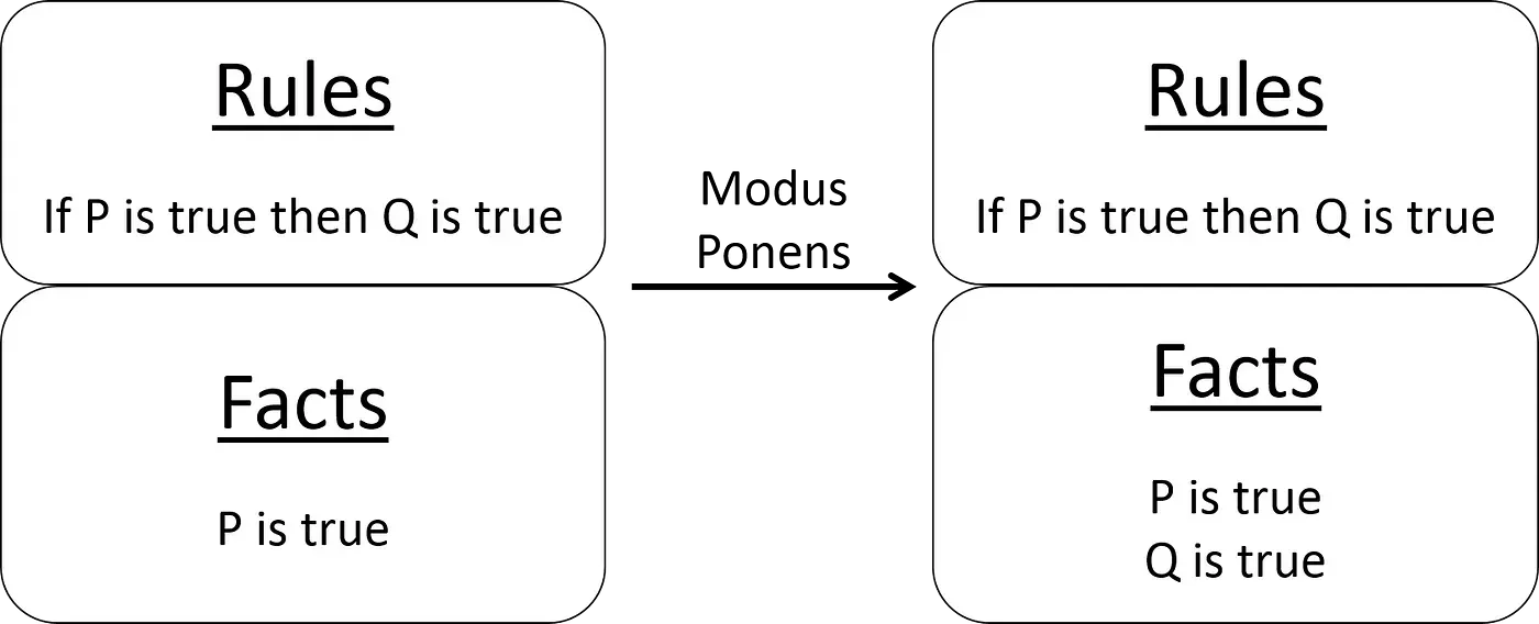 New facts are derived from currently known facts using a very important deductive tool called Modus Ponens which says that when you have a rule like so: If p then q and the fact p is true then the fact q is true.