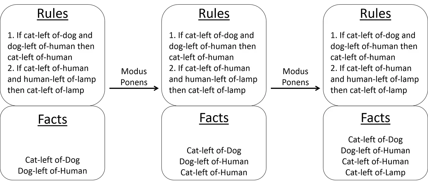 The mechanization process, called rule-matching, applies rules to facts. As an example, consider a situation where there is only one rule: If the cat is to the left of the dog and the dog is to the left of the human then the cat is to the left of the human. Now imagine that there are two facts you know to be true in this situation: There is a cat to the left of the dog and There is a dog to the left of the human The rule-matching process will match these two pieces of information to the rule and create a third fact: There is a cat to the left of the human.