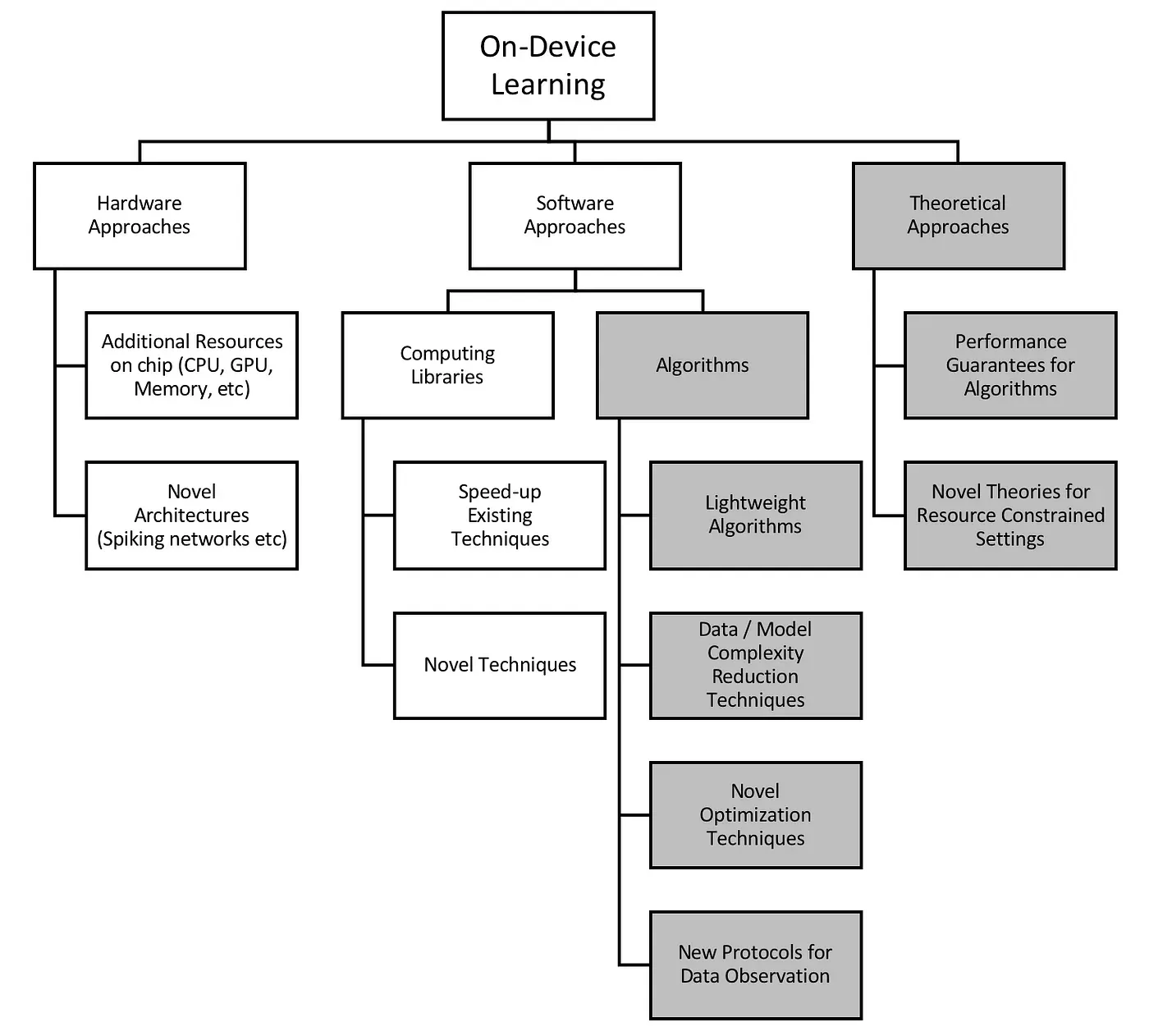 Fig 1 gives a hierarchical view of the ways to improve model training on devices. On the left are the hardware approaches that work with the actual chipsets. Fundamental research in this area aims at improving existing chip design (by developing chips with more compute and memory, and lower power consumption and footprint) or developing new designs with novel architectures that speed up model training. While hardware research is a fruitful avenue for improving on-device learning, it is an expensive process that requires large capital expenditure to build laboratories and fabrication facilities, and usually involves long timescales for development.
